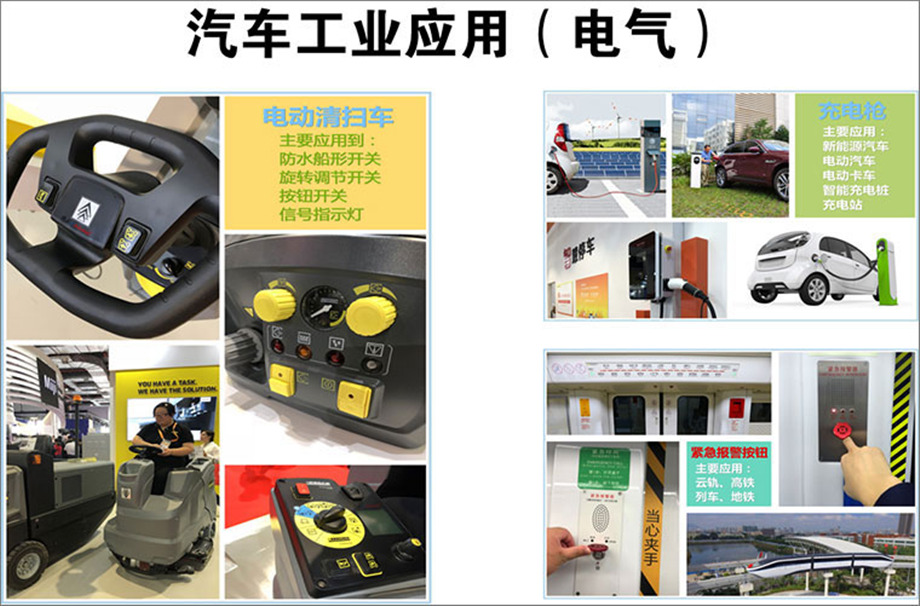 汽車工業(yè)開關(guān)的應(yīng)用德崧(D-SWITCH)在汽車工業(yè)領(lǐng)域里公認(rèn)的可靠、高性能、高品質(zhì)的開關(guān)來為其創(chuàng)新的應(yīng)用和設(shè)計提供動力,汽車開關(guān)的核心價值在于其產(chǎn)品公差、觸覺按需、聲學(xué)適應(yīng)、環(huán)境和工藝密封, 以及機(jī)械或電氣接口集成等特點, 而我們都成功將以上各點交付給客戶。