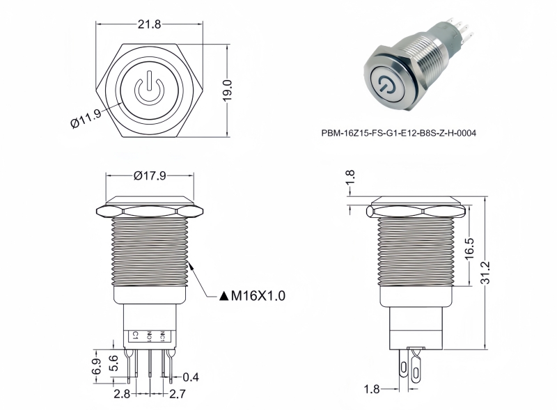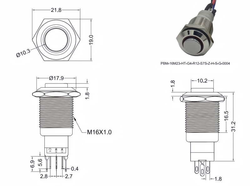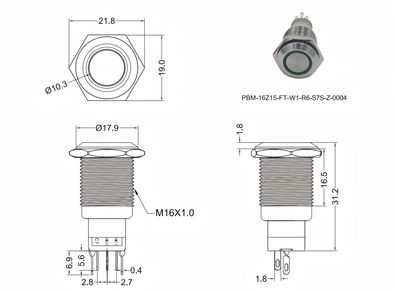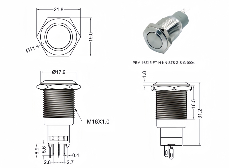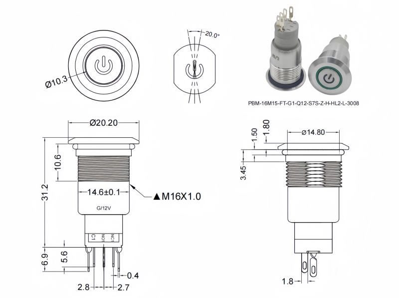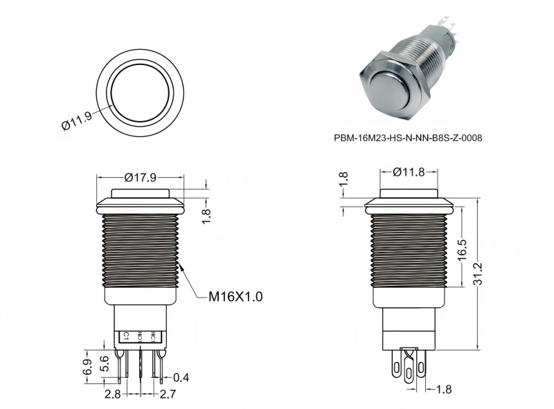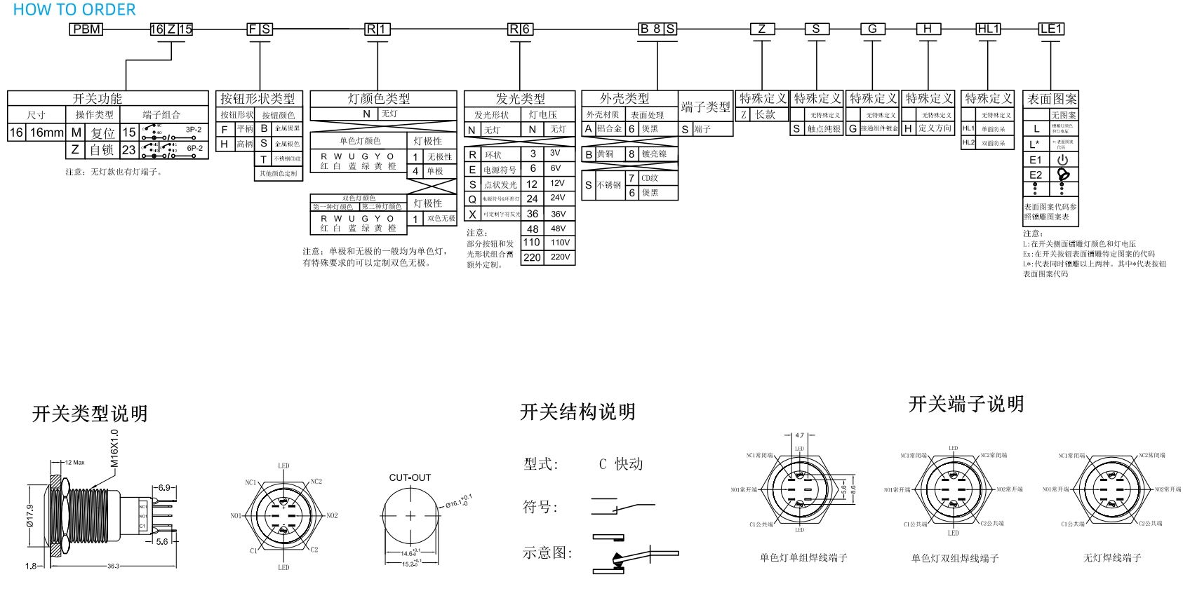 MATERIALS BUSHING : Stainless Steel / Nickel plated brass / Aluminum alloy BASE : PBT, PC ACTUATOR : PC ; Stainless Steel / Nickel plated brass / Aluminum alloy INNER ASSEMBLY : POM / PA66. SPRING : Spring steel. SEALING : Sillicone. O-Ring : Sillicone TERMINAL : Brass,with silver or gold plated. HEX NUT : Nickel plated brass