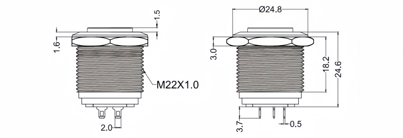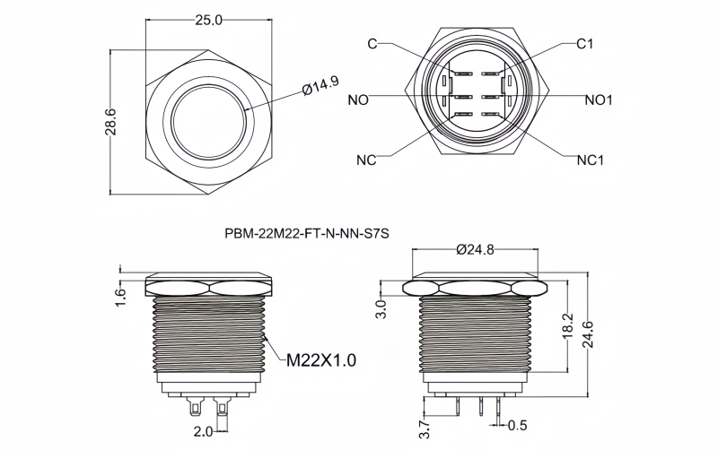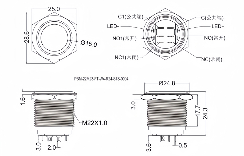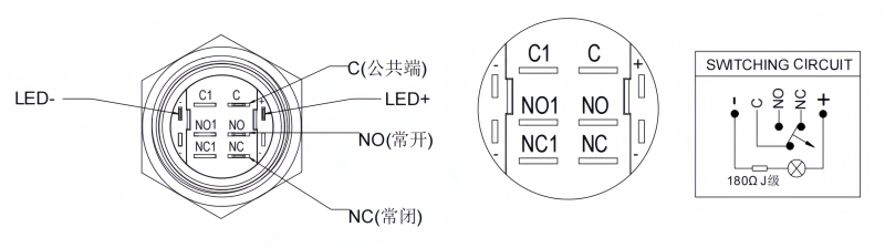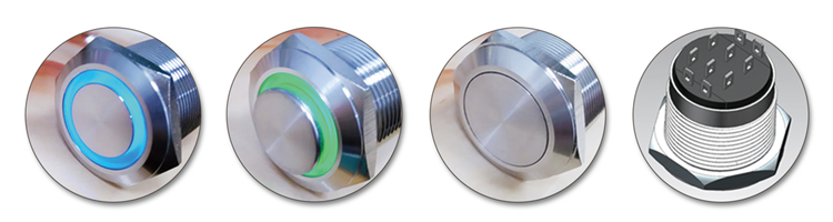 MATERIALS BUSHING : Stainless Steel / Nickel plated brass / Aluminum alloy BASE : PBT, PC ACTUATOR : PC ; Stainless Steel / Nickel plated brass / Aluminum alloy INNER ASSEMBLY : POM / PA66. SPRING : Spring steel. SEALING : Sillicone. O-Ring : Sillicone TERMINAL : Brass,with silver or gold plated. HEX NUT : Nickel plated brass