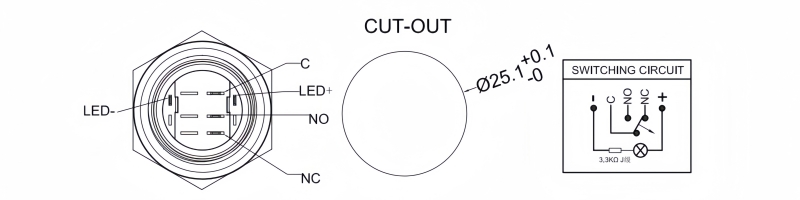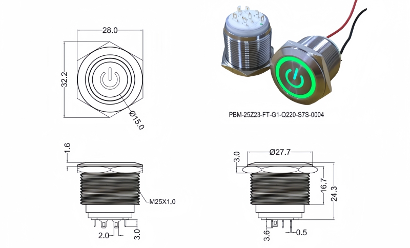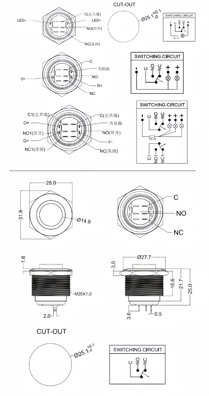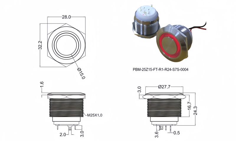 MATERIALS BUSHING : Stainless Steel / Nickel plated brass / Aluminum alloy BASE : PBT, PC ACTUATOR : PC ; Stainless Steel / Nickel plated brass / Aluminum alloy INNER ASSEMBLY : POM / PA66. SPRING : Spring steel. SEALING : Sillicone. O-Ring : Sillicone TERMINAL : Brass,with silver or gold plated. HEX NUT : Nickel plated brass