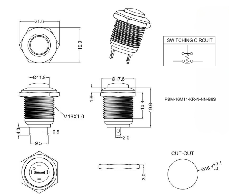 SPECIFICATIONS Panel Thickness: Ø16.30mm Circuit: SPST Function: Momentary