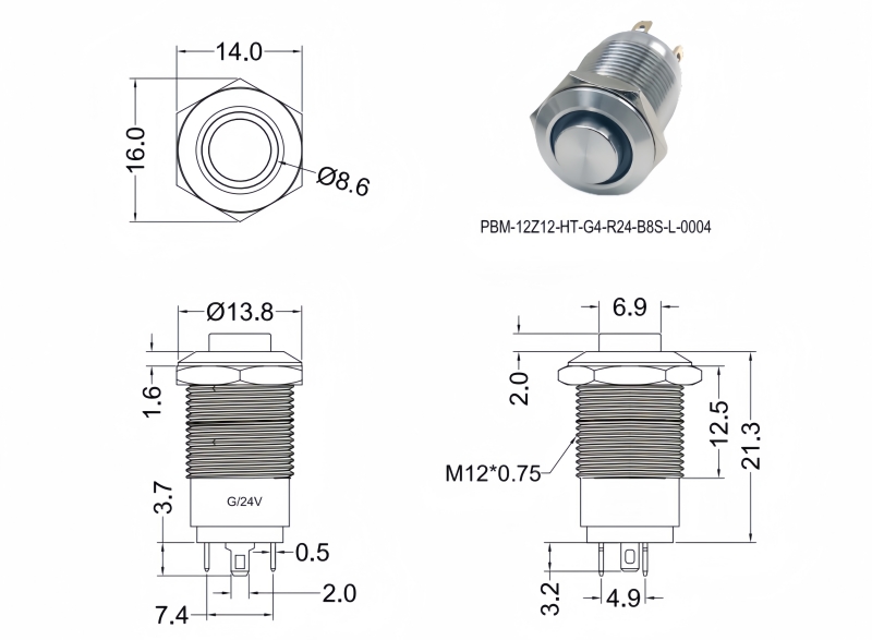 Panel Thickness: Ø12.20mm Function:ON-OFF Latching Contact Rating: 3A 250AV 0.2A 250VAC 0.5A 12VDC Mechanical Life: 100,000 cycles Electrical Life: 50,000 make-and-break cycles at full load Torque: 5~14Nm Travel: About 2.0mm