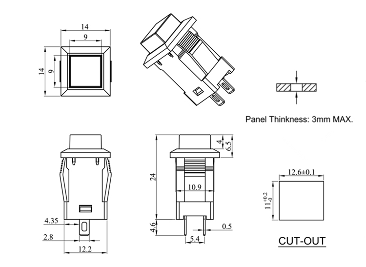 SPECIFICATIONS Contact Rating: 1.5A 250VAC 3A 125VAC Mechanical Life: Momentary 100,000 cycles Self-lock 50,000 cycles Electrical Life: 10,000 cycles make-and-break cycles. Torque: 3~8Nm Travel: About 2.5mm