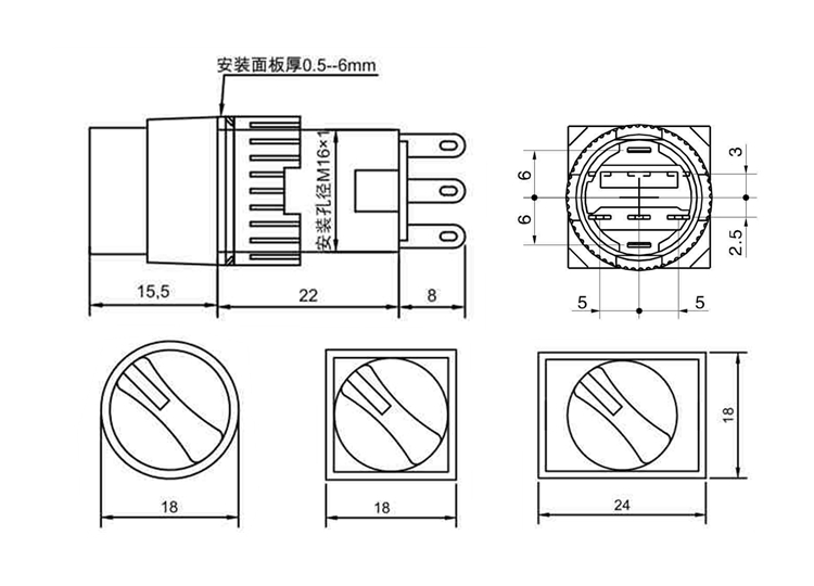 SPECIFICATIONS Panel Thickness: Ø16.20mm Contact Rating: 6A 250VAC/440V Mechanical Life: 20,000 cycles Electrical Life: 10,000 cycles make-and-break cycles. Torque: 3~8Nm
