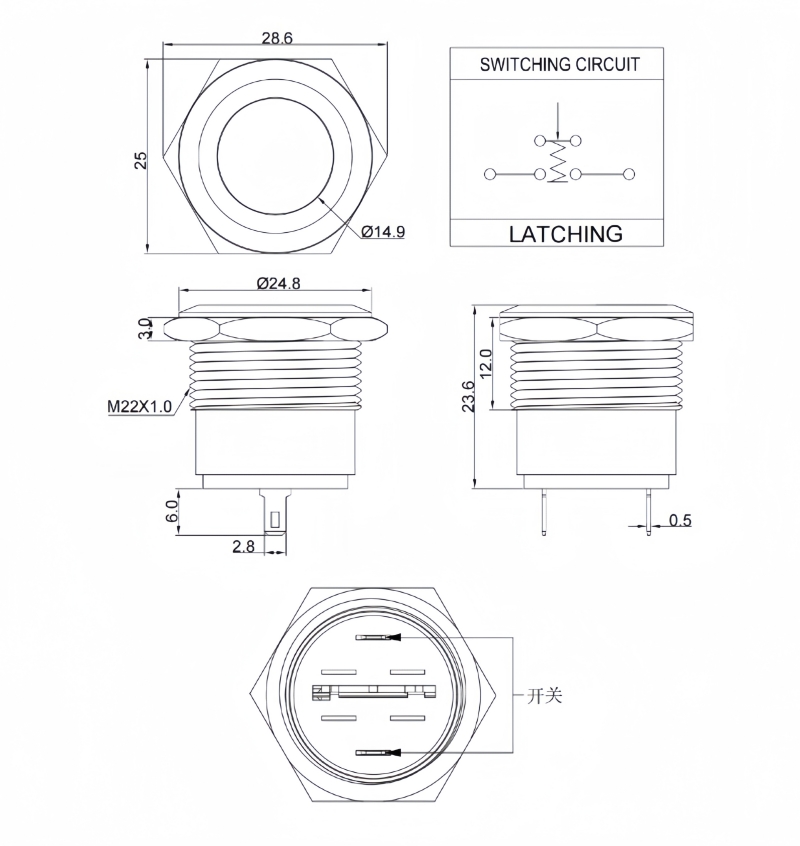 MATERIALS BUSHING : Stainless Steel / Nickel plated brass / Aluminum alloy BASE : PBT, PC ACTUATOR : PC ; Stainless Steel / Nickel plated brass / Aluminum alloy INNER ASSEMBLY : POM / PA66. SPRING : Spring steel. SEALING : Sillicone. O-Ring : Sillicone TERMINAL : Brass,with silver or gold plated. HEX NUT : Nickel plated brass