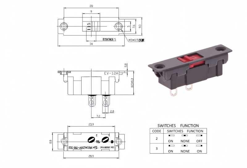Contact Resistance: 20 mΩ max. Dielectric Strength: 2000 V AC for 1 minute Operating force: 500±200gram Operating Temperature: -20°C to +85°C