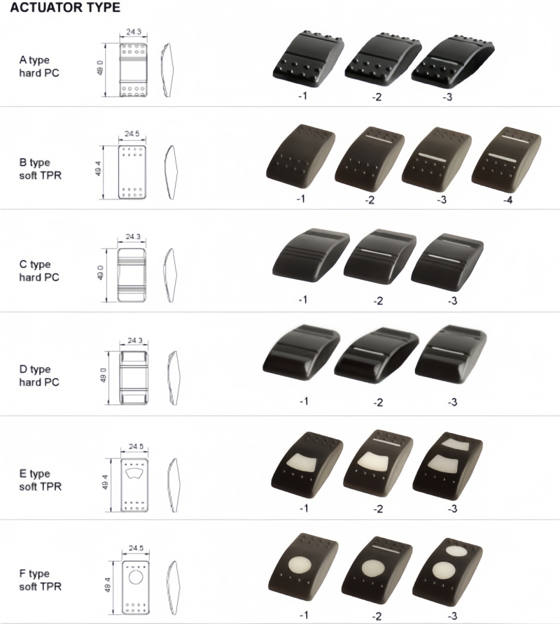 Contact Configuration: ON-OFF ON-ON (ON)-OFF ON-(OFF) ON-OFF-ON (ON)-OFF-(ON )