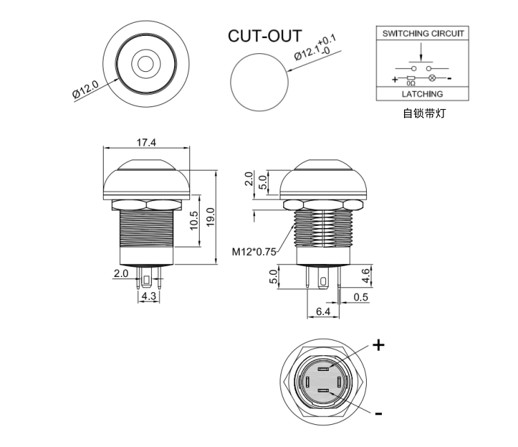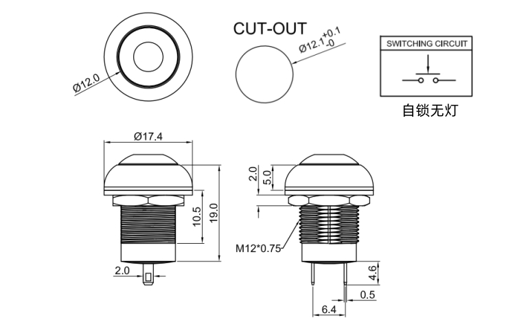 SPECIFICATIONS Panel Thickness: Ø12.30mm Contact Rating: 0.2A 250VAC 0.5A 12VDC Mechanical Life: 100,000 cycles Electrical Life: 50,000 cycles make-and-break cycles. Torque: 3~8Nm Travel: About 3.0mm