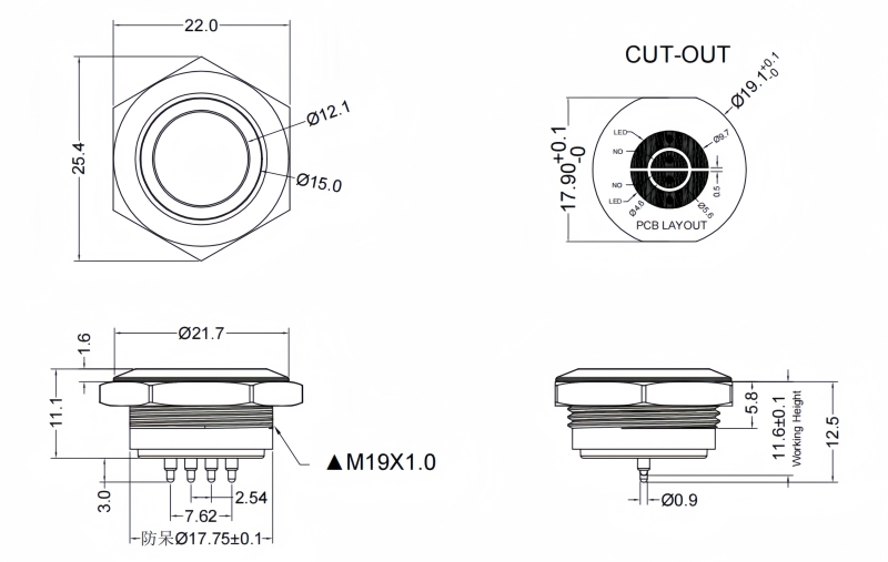 MATERIALS BUSHING : Stainless Steel / Nickel plated brass / Aluminum alloy BASE : PBT, PC ACTUATOR : PC ; Stainless Steel / Nickel plated brass / Aluminum alloy INNER ASSEMBLY : POM / PA66. SPRING : Spring steel. SEALING : Sillicone. O-Ring : Sillicone TERMINAL : Brass,with silver or gold plated. HEX NUT : Nickel plated brass
