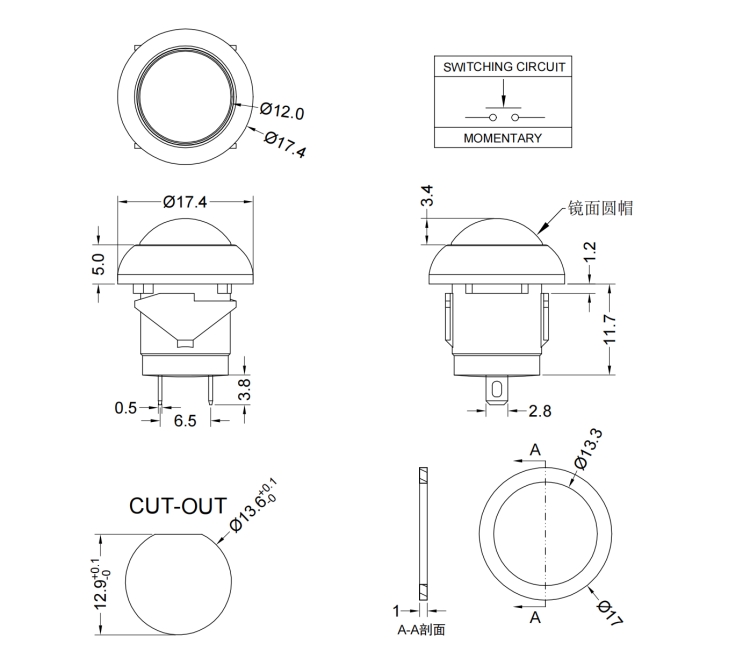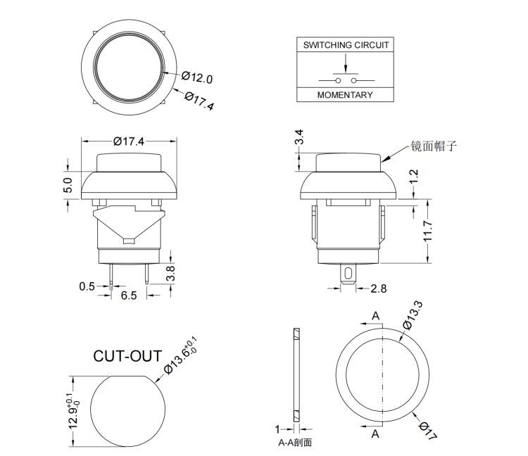 SPECIFICATIONS Panel Thickness: Ø12.30mm Function:(ON)-OFF Momentary