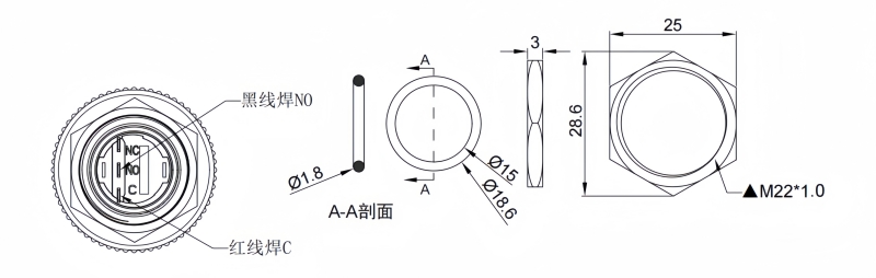 MATERIALS BUSHING : Stainless Steel / Nickel plated brass / Aluminum alloy BASE : PBT, PC ACTUATOR : PC ; Stainless Steel / Nickel plated brass / Aluminum alloy INNER ASSEMBLY : POM / PA66. SPRING : Spring steel. SEALING : Sillicone. O-Ring : Sillicone TERMINAL : Brass,with silver or gold plated. HEX NUT : Nickel plated brass